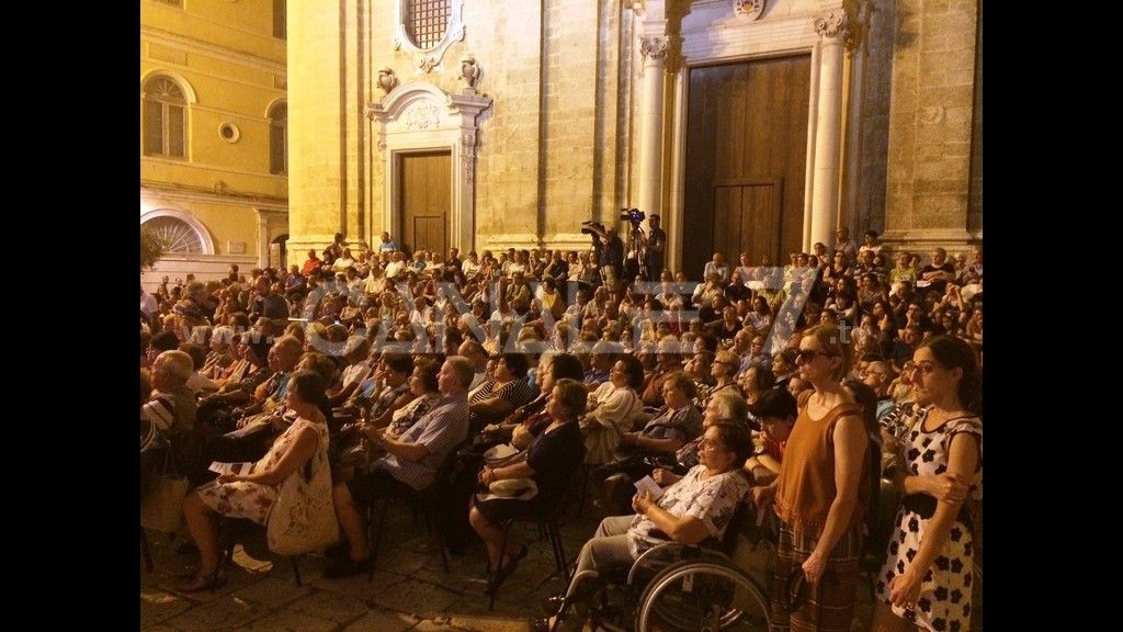 Sagrato della Cattedrale di Monopoli gremitissimo ieri sera ( martedì 31 luglio 2018) dove per l’apertura del mese dedicato alla Patrona, Maria Santissima della Madia, è stato rappresentato il Dramma Sacro “Il dono del Cielo’ che evoca l’approdo dell’Icona della Madonna della Madia. Il testo, del 1774 del frate Pasquale Maria Freda, dei minimi, mentre la parte musicale del canonico Onofrio Van Westerhout, allora organista nella cattedrale di Monopoli, andò dispersa. Le musiche però sono state realizzate dal m° Martino Palmitessa, compositore e direttore d’orchestra, che ha provveduto a riscrivere una partitura molto ampia. Del maestro Palmitessa sono anche orchestrazione, concertazione e direzione musicale. La rappresentazione, oltre alla parte orchestrale ha visto la partecipazione del coro Almadia e i personaggi del dramma: baritono (Angelo De Leonardis), soprano (Marzia Saba Rizzi), mezzosoprano (Angela Masi), basso (Giacomo Selicato), tenore (Donato Lillo-Tarì). Al termine del concerto, alla mezzanotte, l’inizio del mese mariano è stato salutato con l’accensione del quadro di Maria Santissima della Madia allocato alla sommità del campanile della cattedrale.