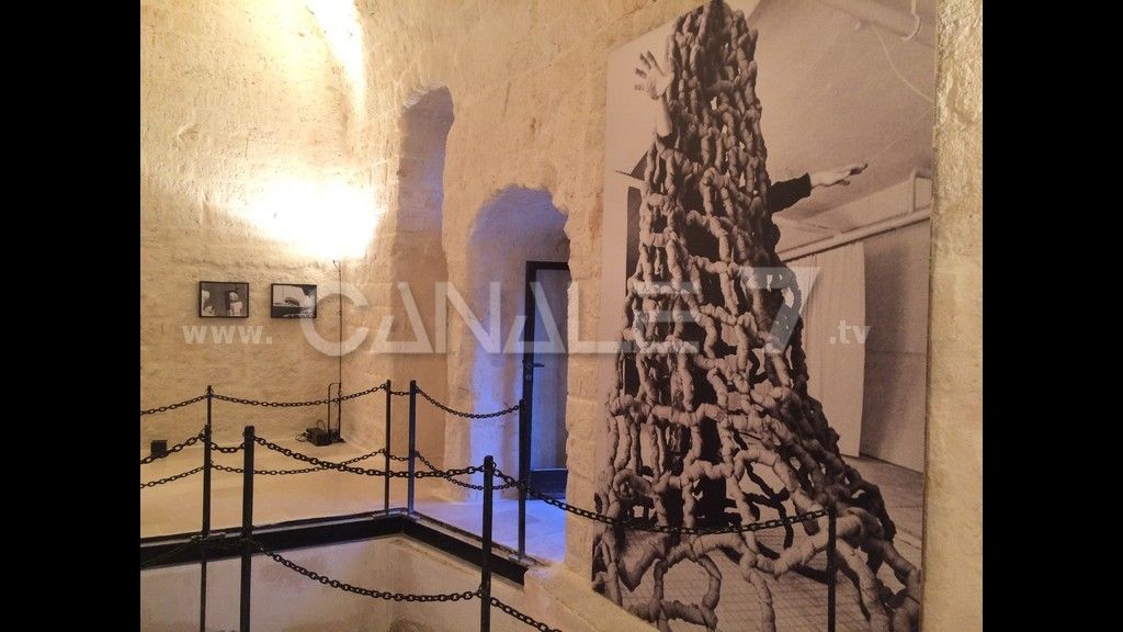 Il giro a Palazzo Palmieri si chiude con le ultime tre installazioni di arte contemporanea in collaborazione con Crac Puglia. , lavoro chedefinisce l’unità minima di esistenza e lo spazio di movimento di uomini privati della propria libertà, come i migranti che cercano di ridefinire la propria identità a partire dalla ricerca di un luogo di vita, di una “dimora”. L’opera di Francesco Strabone “Mai, 2018” si compone di una imbarcazione sulla quale l’artista brindisino depone un cumulo di ossa scolpite in gesso e argilla alludendo ai tragici eventi migratori in forma votiva. La sala che ospita il relitto diviene luogo di meditazione e mistero. E ancora “le recenti vicende migratorie nel Mediterraneo sono ricordate dalle otto vasche metalliche piene di olio nero che rimandano alla fredda serialità del conteggio dei corpi ritrovati in mare e dei feretri disposti di fronte allo sguardo impassibile dell’osservatore.