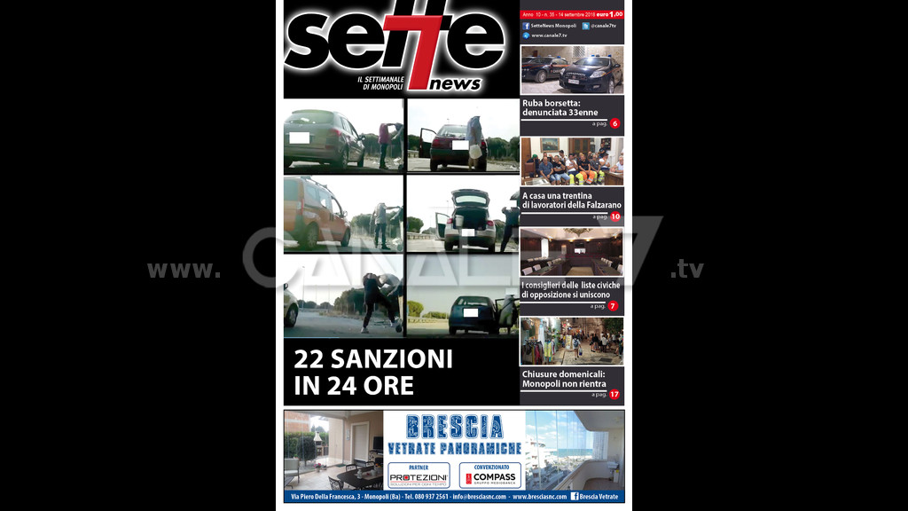 È in edicola SetteNews il settimanale di Monopoli. In copertina, 22 sanzioni in 24 ore operazione di controllo del comando di polizia locale a contrasto dell’abbandono indiscriminato di rifiuti; di spalla, Ruba borsetta: denunciata 33enne è successo nel corso di una serata di intrattenimento in un noto locale sul mare; A casa una trentina di lavoratori della Falzarano il provvedimento dal prossimo primo ottobre e intanto il sindaco ha ascoltato i dipendenti; I consiglieri delle liste civiche di opposizione si uniscono l’idea nasce per compattare le liste civiche provenienti dalla coalizione di Nuccio Contento; Chiusure domenicali: Monopoli non rientra il provvedimento non tocca i comuni ritenuti di alto interesse turistico. All’interno, come sempre, troverete una ricca pagina di cronaca, attualità, approfondimenti sulla politica, la vita in città e naturalmente lo sport con tutte le novità sulle squadre cittadine. Quindi rubriche e appuntamenti. Questo e tanto altro su Sette News, il settimanale di Monopoli, in tutte le edicole.