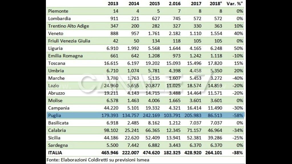 La Puglia si conferma la principale regione di produzione, nonostante il calo del 58%, secondo le previsioni di ISMEA, nonostante l’ondata di maltempo dell’inverno e dell’estate e degli effetti – denuncia Coldiretti Puglia - delle gelate di febbraio e marzo che hanno arrecato danni ingenti nella fase della fioritura