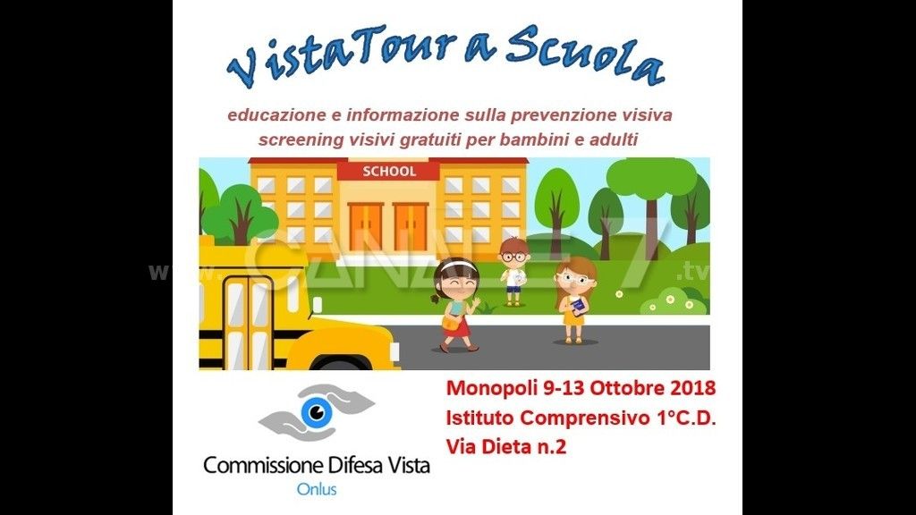 ( Da comunicato) - Screening visivi e attività di educazione alla prevenzione visiva per la Giornata Mondiale della Vista: Commissione Difesa Vista Onlus debutta a Monopoli con il “Vistatour a Scuola”, dal 9 al 13 ottobre 2018. L’iniziativacoinvolgerà l’Istituto Comprensivo 1° C.D. Via Dieta e ha lo scopo di sensibilizzare bambini e famiglie sulla salute della vista.