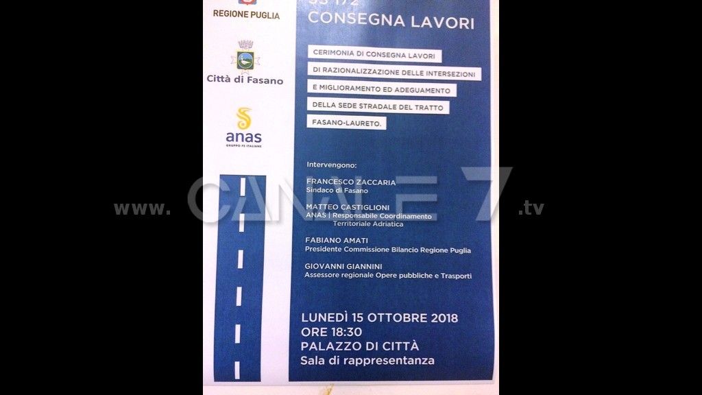 Ieri sera ( lunedì 15 ottobre 2018) nella sala di rappresentanza del Comune di Fasano è stata finalmente effettuata la firma per la consegna dei lavori di messa in sicurezza e allargamento della strada statale 172 dir.I tecnici di Anas e società esecutrice dei lavori, l’impresa PA & CO Srl di Matera, hanno sottoscritto il contratto. Il costo dell'opera sarà di 5.250.000 euro, con un ribasso del 40%. L'importo totale stanziato dalla Regione Puglia è di 13.370.000 euro. I lavori dovrebbero iniziare entro la prima decade del prossimo mese di novembre per una durata prevista di 450 giorni.Va ricordato che il finanziamento venne stanziato nel 2011 dalla Giunta Regionale.