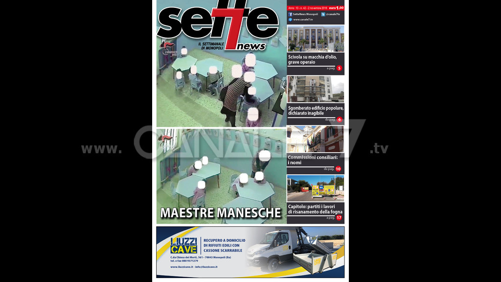 In copertina, Maestre manesche maltrattamenti a danno di piccoli alunni treenni della scuola per l’infanzia a Capurso, fra loro anche una monopolitana; di spalla, Scivola su macchia d’olio, grave operaio bruttoincidente sul lavoro nella zona industriale di Monopoli; Sgomberato edificio popolare dichiarato inagibile è stato evacuato dopo l’intervento dei vigili del fuoco per il rischio cedimento della parete ornamentale esterna; Commissioni consiliari: i nomi sono stati ufficializzati membri e presidenti delle cinque commissioni permanenti; Capitolo: partiti i lavori di risanamento della fogna l’intervento riguardante la fogna nera è previsto ad opera di acquedotto pugliese.