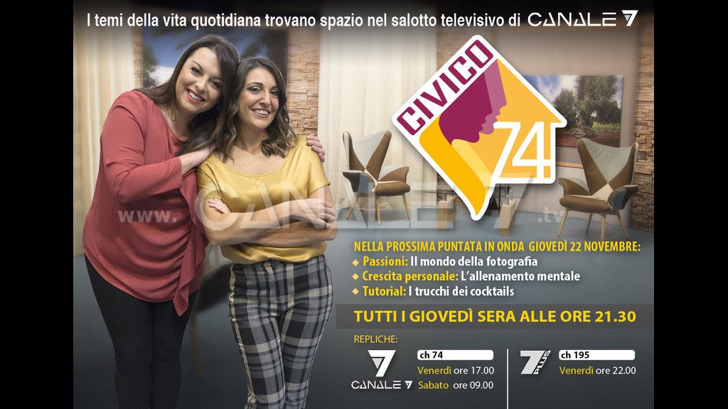 Torna Civico 74, il salotto televisivo di Canale 7 condotto da Viviana Tanzariello e Maristella Curri. Questa settimana si parlerà di salute in particolare della memoria, quali e quando effettuare controlli, ospite la neuropsicologa Eleonora Russo. Spazio poi alla casa, in questa puntata focus sulle pareti interne: come decorarle? Con quali materiali, colori e dove? In studio l’architetto Aurelia Pacielli. Lo spazio tutorial è dedicato al mondo maschile: come fare i nodi alla cravatta ma anche quanti tipi di tessuti e come abbinarli al meglio con il personal shopper Donato Gentile. Civico 74 è visibile anche in streaming questa sera alle 21.30 venerdì alle 17.00 e sabato alle 09.00 e poi on demand su , app e la pagina Youtube di Canale 7