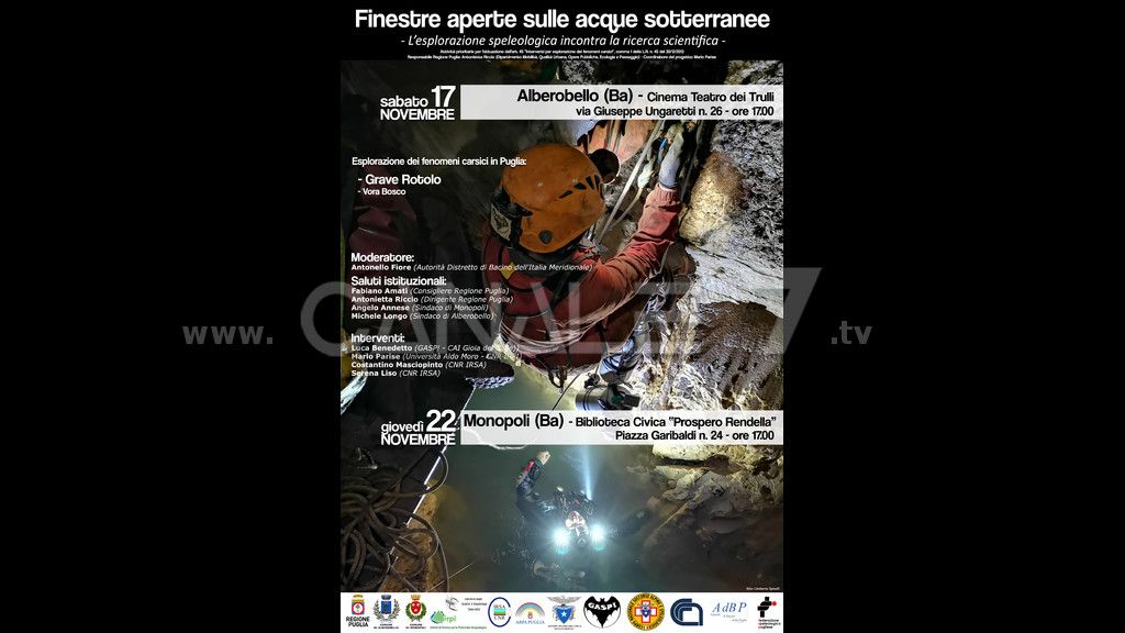 “ L'esplorazione dei fenomeni carsici di recente scoperta” e tra questi soprattutto la Grotta Rotolo, è stato il tema sabato scorso 17 novembre ad Alberobello presso il Cinema teatro dei trulli di un convegno che ha visto protagonista il gruppo Gasp! della sezione CAI di Gioia del Colle, insieme al CNR IRPI, CNR IRSA, ARPA Puglia, Autorità Distretto di Bacino dell’Italia Meridionale, CNSAS, Federazione Speleologica Pugliese, Comune di Alberobello, per un convegno durante il quale sono stati resi noti tutti i dati rilevati durante un progetto finanziato dalla Regione Puglia del 2013, a firma del consigliere Fabiano Amati. La seconda parte del convegno si svolgerà a Monopoli giovedì 22 novembre prossimo, presso la Biblioteca Prospero Rendella.