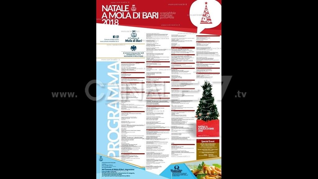 E’ in corso il programma natalizio del comune di Mola di Bari, promosso dalla pubblica Amministrazione con la collaborazione delle associazioni socio-culturali e di categoria nonché delle attività produttive.E’ un natale ricco di sorprese, ricco di luci con le strade animate da concerti, spettacoli, mercatini enogastronomici e di artigianato locale nonché offrirà l’occasione di usufruire di visite guidate gratuite.