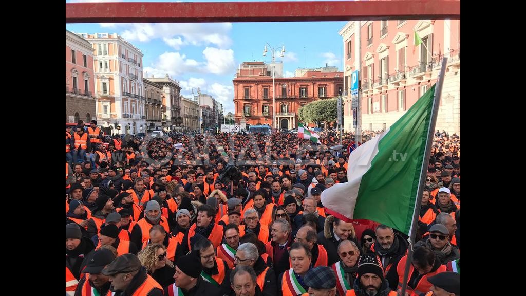 Sono oltre tremila gli agricoltori pugliesi che con i loro trattori hanno riempito, questa mattina, piazza Prefettura, a Bari, colorandola di arancione, il colore della protesta contro il governo nazionale e la Regione Puglia.