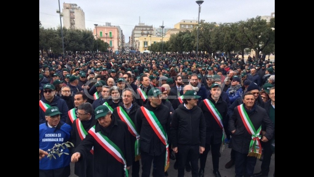 . Tremila agricoltori alla grande manifestazione di Bari, altri 2mila a Monopoli: gli agricoltori sono gli unici ad aver capito che ci troviamo di fronte a un bivio. Basta con i ritardi sulla emergenza Xylella. Basta con i ritardi della politica e della burocrazia. È una emergenza e va trattata come tale. Come un terremoto, con fondi e poteri straordinari. Con fondi straordinari da destinare agli agricoltori e ai vivaisti danneggiati e a chi si impegna ad attuare le buone prassi, affinché l’olivicoltura pugliese non rimanga solo un triste ricordo e affinché centinaia di migliaia di famiglie – di agricoltori ma anche di braccianti e frantoiani – possano continuare a vivere e a presidiare le campagne. “Siamo per la ricerca, che va potenziata e sostenuta davvero. Soltanto la scienza può trovare una soluzione efficace contro il batterio. Siamo per le eradicazioni e per i reimpianti nelle zone compromesse, anche con altre specie arboree e con procedure di reimpianto semplificate. Vogliamo che il settore torni a essere produttivo, vivo, remunerativo. E’ necessario istituire una autorità unica di coordinamento, per gestire questa emergenza, con una legge speciale e con poteri straordinari che permettano di attuare quello che la scienza e le norme prevedono per bloccare l’avanzata del batterio, senza perdere ulteriore tempo, oltre quello già perso in 6 anni. Basta con i ritardi della Giustizia. L’inchiesta della Procura della Repubblica di Lecce, partita tre anni fa ormai, non è approdata a nulla, se non aver bloccato il Piano Silletti. I ricorsi al Tar presentati nel novembre 2015 dai proprietari di Oria, ai quali era stata notificata l’ordinanza di eradicazione, hanno creato altri ritardi, altro spazio all’espansione del batterio. Affermiamo con forza il nostro SI alla scienza. Che si applichino, dunque, i protocolli previsti dalla scienza e dalle norme per prevenire l’ulteriore espansione del batterio. Affermiamo con forza il SI al paesaggio. La Piana degli Ulivi Millenari va tutelata. Nel territorio della Piana, oltre a intervenire con i protocolli previsti dalla scienza per scongiurare il contagio, bisogna garantire il monitoraggio periodico. Lottiamo seriamente contro la xylella, altrimenti tra poco avremo solo il deserto”.