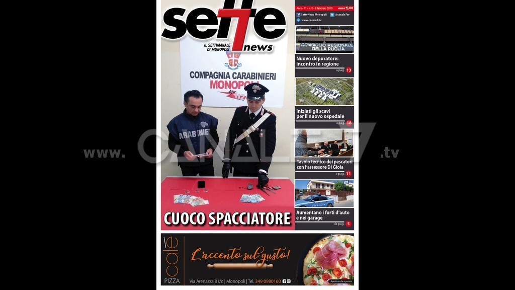 In copertina, Cuoco spacciatore una operazione dei Carabinieri di Monopoli in cui sono stati segnalati anche cinque assuntori; di spalla, Nuovo depuratore: incontro in regione si torna a parlare del progetto del depuratore congiunto tra Monopoli e Polignano a mare; Iniziati gli scavi per il nuovo ospedale è andato a buon fine il reimpianto degli ulivi secolari eradicati; Tavolo tecnico dei pescatori con l’assessore Di Gioia i sindaci sottoscrivono un documento inviato al Ministro Centinaio; Aumentano i furti d’auto e nei garage i ladri portano via soprattutto biciclette.
