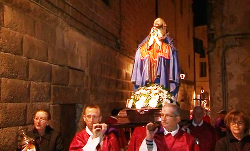 Il Venerdì Santo, insieme alla Processione dei Misteri rappresenta l’appuntamento religioso più intimo e coinvolgente della Settimana Santa monopolitana. Così ieri dopo la celebrazione liturgica “Nella Passione del Signore” nella Basilica Cattedrale ha avuto inizio la Via Crucis presieduta dal Vescovo della Diociesi Conversano-Monopoli Mons. Giuseppe Favale, con la suggestiva sfilata dei sei simulacri settecenteschi in cartapesta di fattura leccese raffiguranti i momenti salienti della passione e morte di Cristo custoditi per l’intero anno nella Chiesa di San Francesco d’Assisi. Il clero, le confraternite, le autorità e tantissimi fedeli, in corteo per le vie cittadine, secondo il rituale di fede che vuole che vengano esposti i sei segni della passione e morte di Gesù Cristo. “Cristo nell’orto”, “Gesù con il capo cinto di spine”, la “Flagellazione alla colonna”, “Sotto il peso della croce”, la Crocifissione” per concludere con la “Deposizione nel sepolcro”. A seguire i simulacri, l’effige della Madonna Addolorata, che si è unita in processione quando il corteo è giunto dinnanzi alla chiesa della Madonna del Suffragio, anche nota come Purgatorio dopo l’invocazione di don Peppino Cito, rettore della basilica cattedrale e vicario zonale. Maria Santissima segue il figlio Gesù nel doloroso viaggio di passione, morte e redenzione.I confratelli segnano il passaggio silenzioso per le vie cittadine allo scandire delle preghiere, con il suono delle troccole, particolari sonagli, maniglie o ferri, che percuotendo il supporto in legno, producono un suono che ricorda i ferri della crocifissione di Cristo. La Via Crucis, scandita quest’anno dalle meditazioni dei Padri della Chiesa, da Sant’Agostino a Sant’Ambrogio passando per San Leone Magno. Dopo aver attraversato il centro cittadino il corteo è poi tornato in largo Plebiscito dove, dopo il saluto e l’augurio pasquale di mons. Giuseppe Favale i sacri simulacri sono rientrati in chiesa. Per consentirne la visione a chi era impossibilitato a recarsi sul posto, anche quest’anno, l’evento è stato trasmesso in diretta su Canale 7 e in streaming su www.canale7.tv.