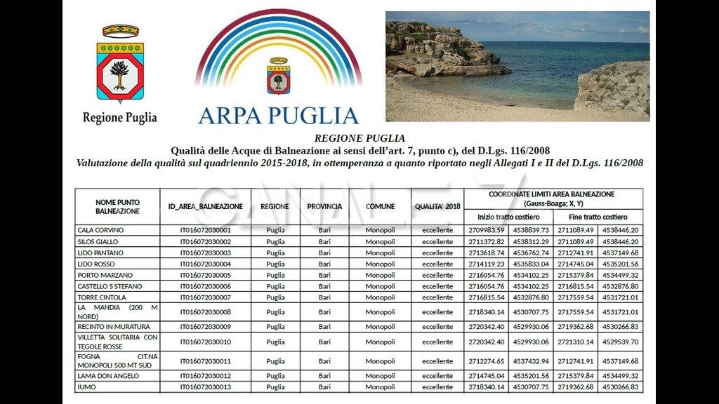 All’ennesima mancata bandiera blu il comune di Monopoli cala l’asso delle acque di balneazione definite “eccellenti”. E si tratta di una conferma. La buona notizia giunta dalla Regione recita così: “ Con deliberazione n. 640 del 9 aprile 2019, la Giunta Regionale ha provveduto a classificare le acque di balneazione per la stagione balneare 2019 (ai sensi degli artt. 7 e 8 del D.Lgs. N. 116/2008) sulla base dei campionamenti effettuati dall’ARPA Puglia. In particolare, per la Città di Monopoli nel corso dell’anno 2018 le analisi sono state compiute su tredici punti della costa dove la qualità dell’acqua è risultata eccellente”. Come detto il campionamento è avvenuto in 13 siti in cui il dato è risultato omogeneo al top. Da nord in località Cala Corvino, passando per Lido Pantano, Porto Rosso, quindi Porto Marzano, S. Stefano, Torre Cintola, Lamandia, e ancora più a sud in località Lama Don Angelo e Iumo. Ovunque acque di balneazioni eccellenti.