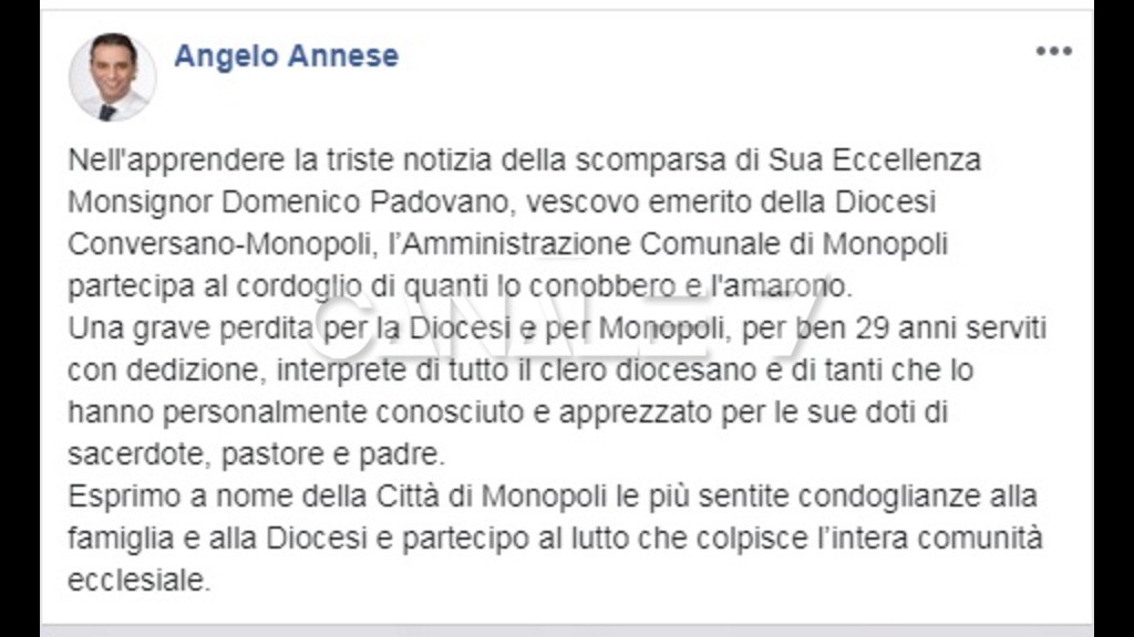 «Nell'apprendere la triste notizia della scomparsa di Sua Eccellenza Monsignor Domenico Padovano, vescovo emerito della Diocesi Conversano-Monopoli, l’Amministrazione Comunale di Monopoli partecipa al cordoglio di quanti lo conobbero e l'amarono». Lo scrive su facebook il Sindaco di Monopoli, Angelo Annese, ricordando Mons. Padovano, scomparso all'età di 78 anni il 10 maggio scorso.