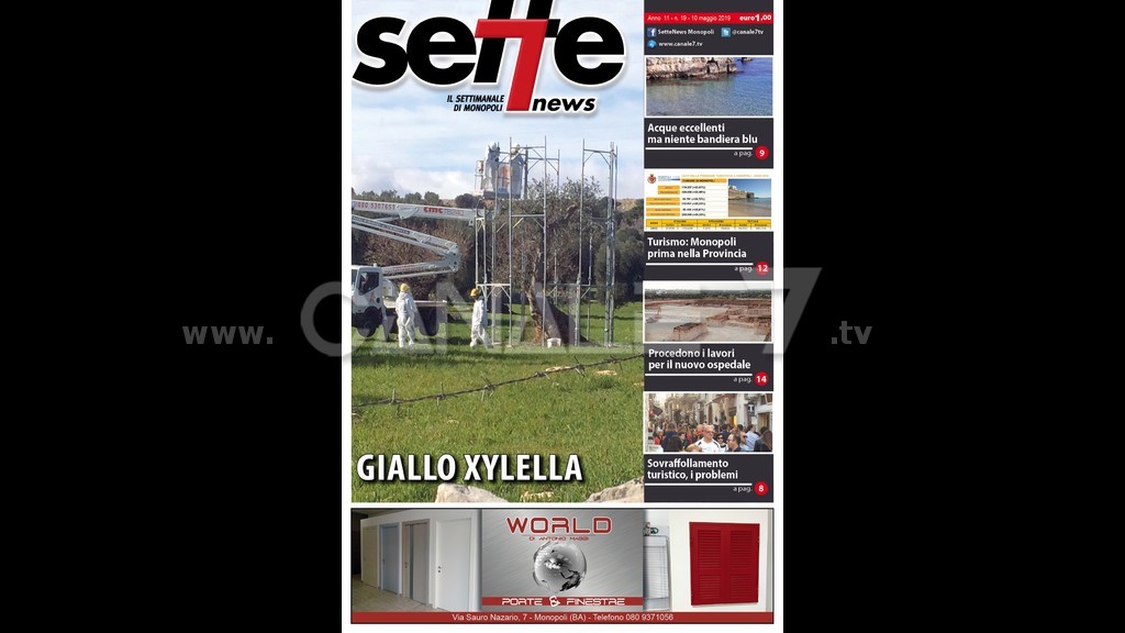 E’ in edicola Sette News, il periodico di Monopoli. In copertina “Giallo Xylella” . Bloccata l’eradicazione della pianta di Contrada Caramanna. Prima infetto, poi non più: giallo sull’ulivo malato di Xylella. All’interno “Acque eccellenti ma niente bandiera blu”. Dopo la mancata Bandiera Blu arriva l’ottima notizia. “ Le acque di Monopoli sono eccellenti”. “Turismo: Monopoli prima nella provincia”. I dati della Regione Puglia. Superate città come Alberobello e Polignano a Mare. Monopoli è l prima meta in provincia di Bari. “ Procedono i lavori per il nuovo ospedale”. Quasi completi gli scavi di due blocchi e la condotta idrica. “ Sovraffollamento turistico, i problemi”. Mobilità, rifiuti, parcheggi, bagni pubblici, cestini, rete fognaria: le criticità che derivano da sovraffollamento turistico. All’interno ampie pagine di cronaca, politica, attualità, sport, nonchè rubriche e curiosità. Sette News è in tutte le edicole di Monopoli.