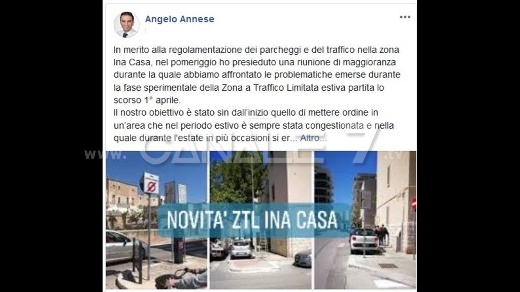 «In merito alla regolamentazione dei parcheggi e del traffico nella zona Ina Casa, nel pomeriggio ho presieduto una riunione di maggioranza durante la quale abbiamo affrontato le problematiche emerse durante la fase sperimentale della Zona a Traffico Limitata estiva partita lo scorso 1° aprile. Il nostro obiettivo è stato sin dall’inizio quello di mettere ordine in un’area che nel periodo estivo è sempre stata congestionata e nella quale durante l'estate in più occasioni si erano verificati problemi per l'accesso ed il passaggio dei mezzi di soccorso», scrive il Sindaco di Monopoli.