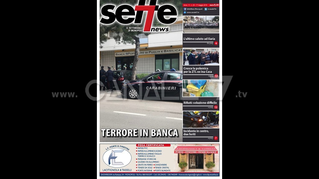 E’ in edicola Sette News, il periodico di Monopoli. In copertina “ Terrore in banca”. Rapinatore solitario alla Banca Popolare di Puglia e Basilicata. Il malvivente, armato di taglierino, si è fatto consegnare il denaro ed è fuggito. All’interno “ L’ultimo saluto ad Ilaria”. Sbalzata fuori dall’auto: muore sul colpo 21enne. La giovane Ilaria Dibello era in compagnia di un’amica a bordo di una Smart. “Cresce la polemica per la Ztl ex Ina Casa”. Ztl Ex Ina Casa: raffica di multe. Insorgono i residenti. Chiedono la revoca immediata della zona a traffico limitato. “Rifiuti: soluzione difficile”. Rifiuti: dal confronto emerge la difficoltà per una soluzione. L’incontro tra i comuni dell’Aro Bari 8 è stato organizzato dal PD. “ Incidente in centro, due feriti”. Incidente in pieno centro: due feriti lievi. Scontro tra una Lancia Y e un’Audi A3. All’interno ampie pagine di cronaca, politica, attualità, sport, nonchè rubriche e curiosità. Sette News è in tutte le edicole di Monopoli.