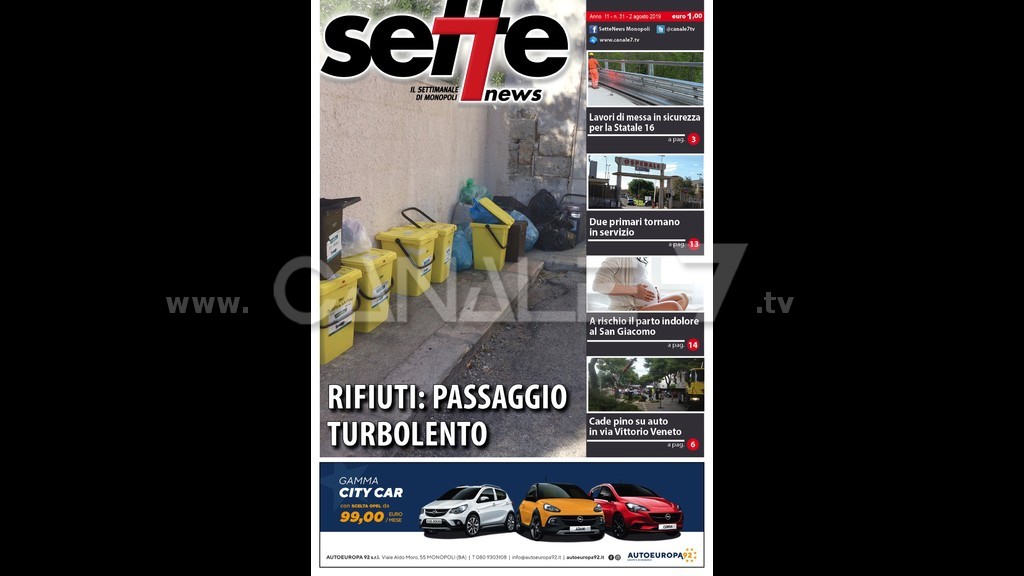 E’ in edicola il nuovo numero di Sette News, il periodico di Monopoli. In copertina “ Rifiuti: passaggio turbolento”. Ampi servizi sul nuovo gestore della nuova ditta, Energetikambiente, che ha vinto la gara ponte per la raccolta dei rifiuti solidi urbani. Passaggio non tranquillo sul quale la ditta uscente, La Falzarano, ha annunciato azioni legali. All’interno “ Lavori di messa in sicurezza per la statale 16”. Previsti l’innalzamento degli standard di sicurezza e il potenziamento della segnaletica stradale. “ Due primari tornano in servizio”. E’ la vicenda giudiziaria dell’ospedale S. Giacomo. Santamato e Di Giulio tornano in libertà, in 19 sospesi dal servizio. La prossima settimana il Tribunale del riesame si esprimerà sulle altre richieste di revoca dalle esigenze cautelari. “ A rischio il parto indolore al S. Giacomo”. Ennesima tegol sul nosocomio monopolitano. Per il consigliere regionale M5S Conca la partoanalgesia è fuori legge. “ Cade pino su auto in via Vittorio Veneto”. Per fortuna non vi era nessuno a bordo. Ma molta paura e preoccupazione tra i residenti. All’interno ampie pagine di cronaca, politica, attualità, sport, nonchè rubriche e curiosità. Sette News è in tutte le edicole di Monopoli.
