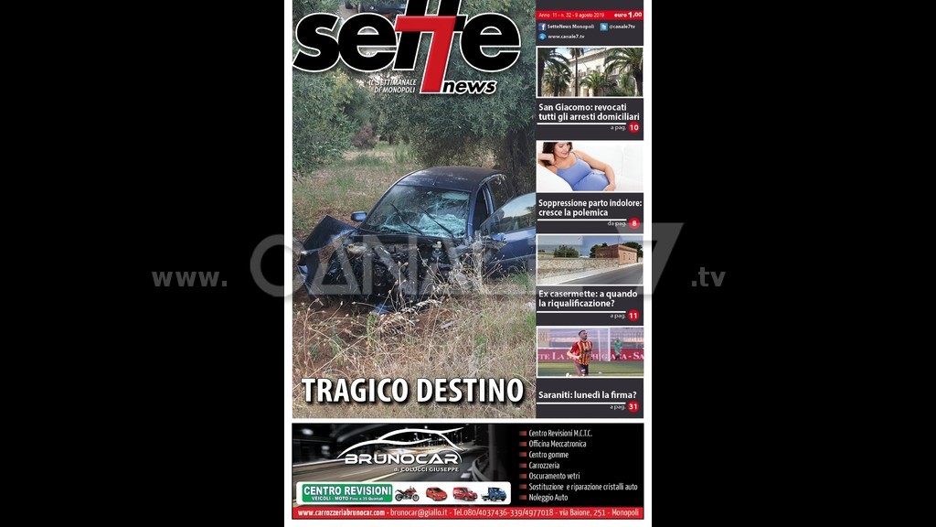 È in edicola SetteNews il settimanale di Monopoli. In copertina, Tragico destino una giovane donna ha perso la vita mentre rientrava a casa insieme a sua figlia di tre anni, miracolosamente viva; di spalla, San Giacomo: revocati tutti gli arresti domiciliari sono liberi al momento tutti i dirigenti medici coinvolti; Soppressione parto indolore: cresce la polemica il sindaco di Monopoli è intervenuto sul caso scatenato dalle dichiarazioni del consigliere regionale Mario Conca; Ex casermette: a quando la riqualificazione? l’area è stata acquisita al patrimonio comunale quasi tre anni fa per realizzare una cittadella della giustizia; Saraniti: lunedì la firma? Il Monopoli Calcio ha trovato l’accordo con l’attaccante. All’interno, come sempre, troverete una ricca pagina di cronaca, attualità, approfondimenti sulla politica, la vita in città e naturalmente lo sport con tutte le novità sulle squadre cittadine. Quindi rubriche e appuntamenti. Questo e tanto altro su Sette News, il settimanale di Monopoli, in tutte le edicole.