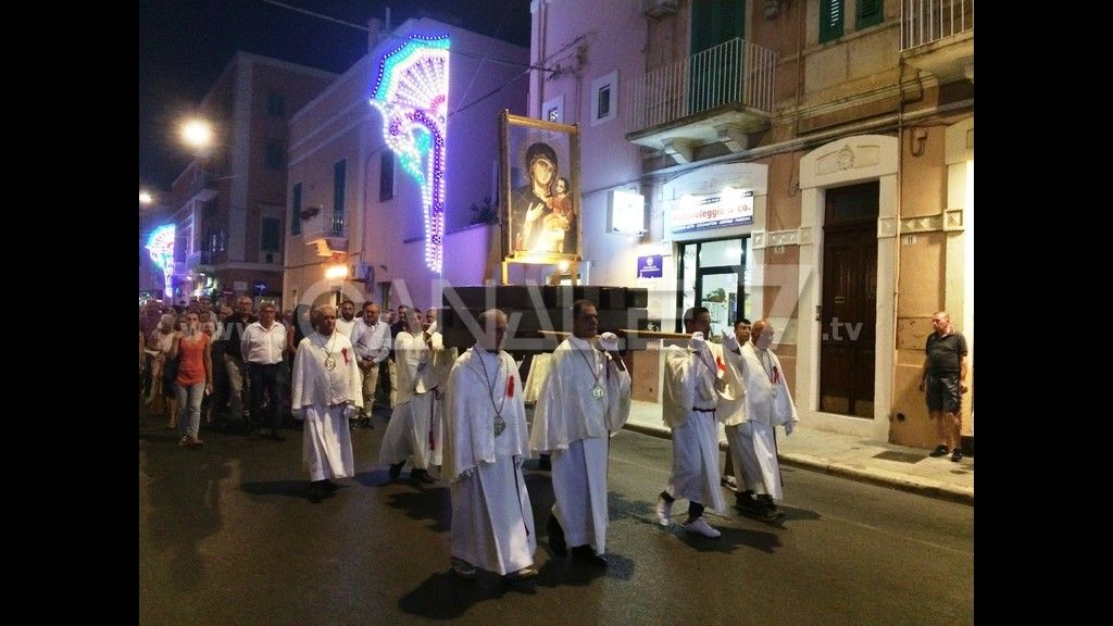 Con la cerimonia di intronizzazione dell’icona di Maria Santissima della Madia, hanno preso il via ieri martedì 13 agosto i festeggiamenti in onore della Madonna della Madia, protettrice di Monopoli. Le celebrazioni andranno avanti sino a venerdì 16 agosto, per concludersi definitivamente 31 agosto, fine del mese mariano. Ieri sera alle 20,15 la processone recante l’immagine della Patrona, proveniente dalla Basilica Santuario della Cattedrale è giunta per l’intronizzazione in largo Plebiscito, nei pressi del municipio, dove è sistemata un’edicola. Al corteo hanno preso parte i volontari dell’Unitalsi, la Confraternita del SS. Sacramentoe al seguito la Banda del Giubileo. Qui il rettore della Cattedrale, don Peppino Cito, ha raccolto in preghiera i moltissimi presenti. Un discorso accorato sui contenuti religiosi della festa è stato pronunciato dal sindaco, Angelo Annese, alla presenza di numerose autorità, tra cui il Comitato Festa Patria, presieduto da Flavio Petrosillo. Quindi l’augurio rivolto a tutti i presenti, monopolitani e i tanti ospiti e turisti, di una buona festa patronale. Infine l’invito alla partecipazione al tradizionale approdo dell’icona della Madonna della Madia, presso Cala Batteria.
