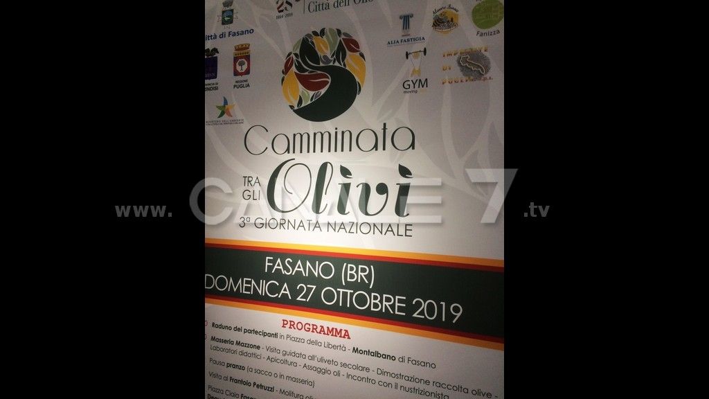 Si è svolta ieri a Fasano ( Br), presso la Sala di Rappresentanza del Comune, la presentazione della 3° Camminata tra gli Olivi, promossa dall'Associazione Nazionale Città dell'Olio, che si svolgerà domenica prossima 27 ottobre. La manifestazione sarà articolata in diversi momenti e interesserà vari luoghi, grazie alla collaborazione con imprese agricole, aziende e associazioni del territorio. Le attività si svolgeranno in parte a Montalbano presso la masseria Mozzone e l'oleificio Petruzzi, per poi concludersi in serata con una festa in piazza Ciaia.