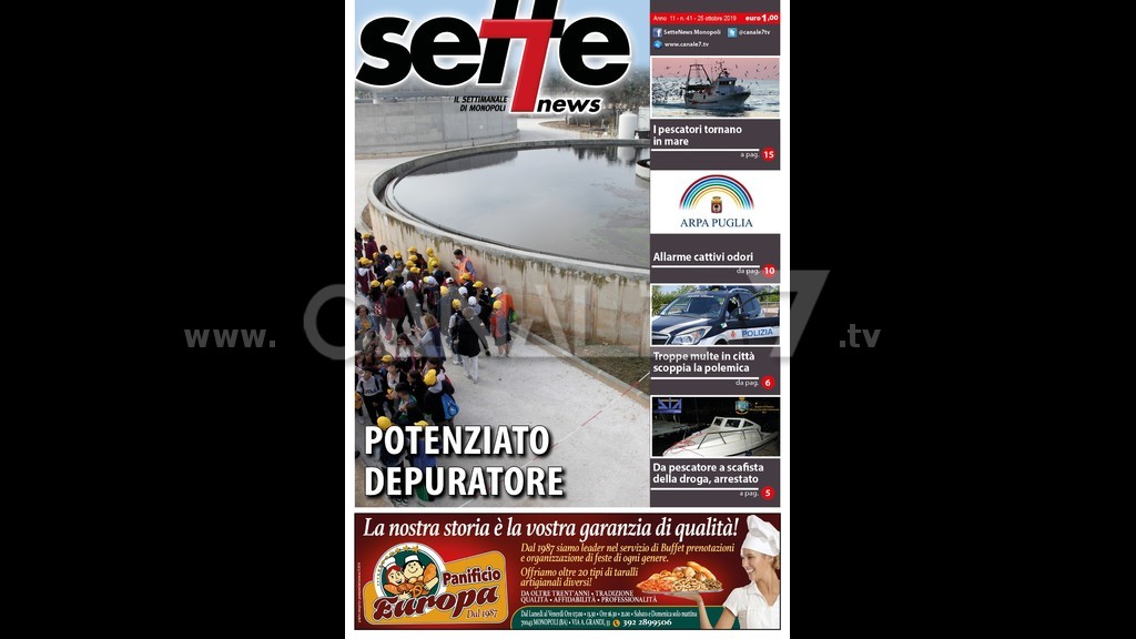 E’ in edicola Sette News, il settimanale di Monopoli. In copertina “ Potenziato depuratore”. Inaugurato il potenziato depuratore di Torre d’Orta. Ma si guarda al depuratore intercomunale Monopoli Polignano. All’interno “ I pescatori tornano in mare”. I pescatori hanno ripreso il mare, ma pronti a nuova proteste, se non arriveranno risposte concrete dell’Ue e soprattutto dal governo. “Allarme cattivi odori” In una lettera il sindaco Annese dice: “ Io e la mia amministrazione non siamo inerti” e chiede l’intervento di Regione e Arpa. “ Troppe multe in città e scoppia la polemica”. Botta e risposta tra il consigliere del Pd Indiveri e il comandante della Polizia Locale, Cassano. “Da pescatore a scafista della droga, arrestato”. Trafficante di droga intercettato al largo di Monopoli, in manette un 48enne fasanese che a bordo aveva mezza tonnellate di stupefacente. Anche in questo numero ampie pagine di cronaca, politica, attualità, sport, rubriche e appuntamenti. Sette News è in tutte le edicole di Monopoli.