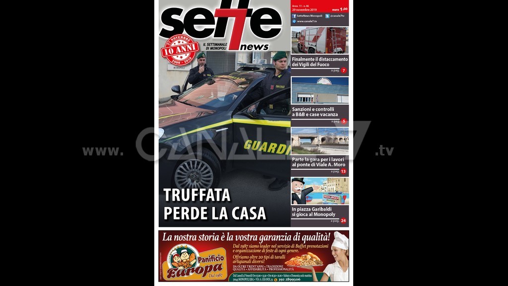 E’ in edicola Sette News, il settimanale di Monopoli. In copertina “ Truffata perde la casa”. Truffa da 200mila euro a una pensionata : le prosciugano il conto e le portano via la casa. La donna è stata tratta in inganno rilasciando una procura a vendere il proprio immobile. All’interno “ Finalmente il distaccamento dei Vigili del Fuoco”. Ad annunciarlo il consigliere regionale del Pd Ruggiero Mennea. “Sanzioni e controlli a B&B e case vacanza”. Sanzioni per 23 mila euro. Ad operare il Nucleo Annona della Polizia Locale di Monopoli. “ Parte la gara per i lavori al ponte di Viale Aldo Moro”. L’assessore ai Lavori Pubblici Gianni Palmisano dice: il ponte è monitorato e presto partirà la gara per i lavori di riqualificazione. Le attenzioni a strutture del genere dopo i crolli in Liguria. Dunque si accendono i riflettori sul ponte di Viale Aldo Moro. “ In piazza Garibaldi di gioca al Monopoly”. Nel weekend si gioca al Monopoly in piazza Garibaldi. Pedine giganti e tabellone nella bella piazza del centro storico. In questo numero ampie pagine di cronaca, politica, attualità, sport, rubriche e appuntamenti. Sette News è in tutte le edicole di Monopoli.