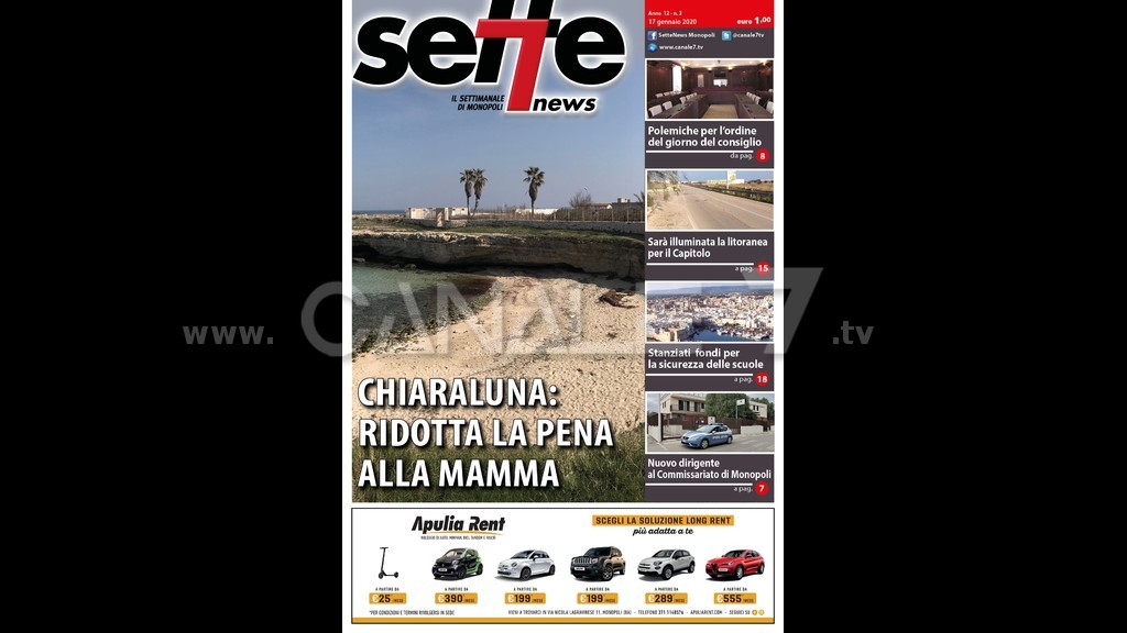 E’ in edicola Sette News. In copertina “ Chiaraluna: ridotta la pena alla mamma”. Abbandonò la figlia appena nata: ridotta la pena alla mamma di Chiaraluna. La piccola morì per il freddo su una spiaggia a nord della città. All’interno “Polemiche per l’ordine del giorno del consiglio”. L’opposizione contesta l’ordine del giorno. Polemica per l’inserimento in coda del monitoraggio ambientale nel consiglio comunale di martedì 21 gennaio. “ Sarà illuminata la litoranea per il Capitolo”. Dal prossimo febbraio via ai lavori per la messa in opera di 68 pali. “ Stanziati fondi per la sicurezza nelle scuole”. 200mileuro per la sicurezza nelle scuole del sudest barese. L’on. Scagliusi del M5Stelle segnala che a Monopoli saranno sette i plessi che ne beneficeranno. “ Nuovo dirigente al Commissariato di Monopoli”. Arriva da Rimini il nuovo dirigente del Commissariato di P. S. è il dottor Marcello Pedrotti. Arriva a sostituire il dott. Walter Lomagno, destinato a nuovo incarico. In questo numero ampie pagine di cronaca, politica, attualità, sport, rubriche e appuntamenti. Sette News è in tutte le edicole di Monopoli.