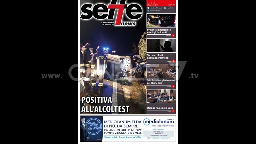 E’ in edicola Sette News. In copertina “ Positiva all’alcol test”. Una 57enne monopolitana trovata positiva all’alcol test dopo un incidente stradale. Ritirata la patente. All’interno “Provinciali pericolose molti incidenti”. Sinistri nel territorio monopolitano che hanno decretato la pericolosità delle strade di pertinenza provinciale. “ Tornano i furti negli appartamenti”. Furti a raffica negli appartamenti in zona Sant’Anna. Segnalata la presenza di due uomini a volto coperto. “ Scintille in consiglio comunale per il piano casa”. Il piano casa non cambia: bocciata la proposta dell’opposizione. Cassato l’emendamento degli otto consiglieri di minoranza sulla delibera dello scorso aprile. “ Strappo finale nella Lega”. Il segretario leghista Piero Barletta defenestrato da capo gruppo consiliare. Colpo di mano dei quattro consiglieri : al suo posto Giuseppe Campanelli. In questo numero ampie pagine di cronaca, politica, attualità, sport, rubriche e appuntamenti. Sette News è in tutte le edicole di Monopoli.