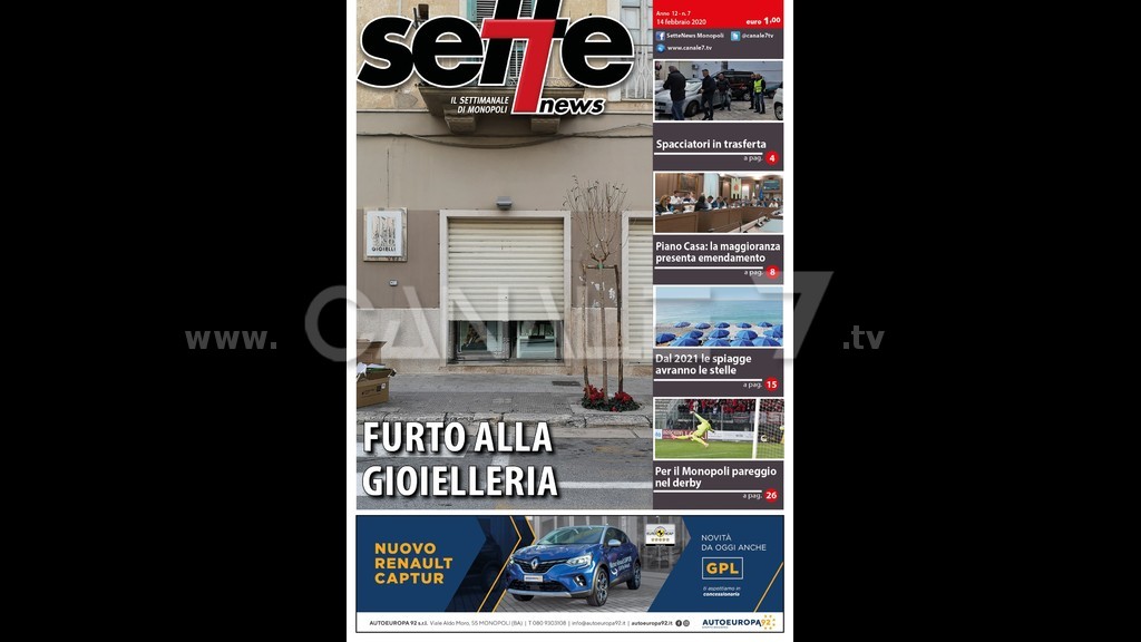 E’ in edicola Sette News. In copertina “ Furto alla gioelleria”. I ladri portano via preziosi per 30 mila euro. All’interno “ Spacciatori in trasferta”. Un’intera famiglia fasanese, arrestata dai carabinieri, vendeva droga a Monopoli. “Piano Casa : la maggioranza presenta emedamento”. L’emendamento presentato di partiti di maggioranza è una modifica alla delibera sul Piano Casa. “ Dal 2021 le spiagge avranno le stelle”. Parte la classificazione delle spiagge con le stelle marine. I gestori dei lidi avranno un anno per adeguarsi alle nuove regole.“ Per il Monopoli pareggio nel derby”. Festa sugli spalti per l’atteso derby con il Bari terminato alla pari 2-2. In questo numero ampie pagine di cronaca, politica, attualità, sport, rubriche e appuntamenti. Sette News è in tutte le edicole di Monopoli.