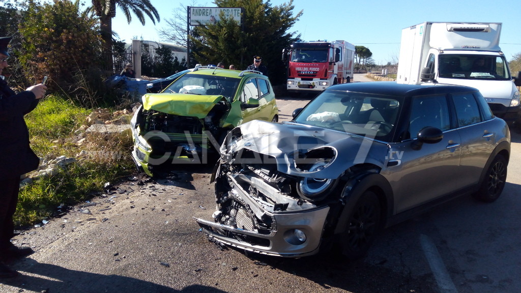 Spettacolare incidente, in tarda mattinata, a pochi chilometri da Conversano, a qualche centinaio dalla rotatoria di Triggianello. Una donna residente in contrada Sicarico è stata condotta al “San Giacomo” di Monopoli solo per accertamenti, ma per fortuna senza gravi conseguenze. Tutta da ricostruire la dinamica dell'incidente: certo è che entrambe le auto hanno subito gravi danni alla parte anteriore tanto da renderle praticamente inutilizzabili. A bordo della Chevrolet gialla viaggiavano due donne: una, residente in Contrada Sicarico, come detto è stata condotta in ospedale a scopo precauzionale, per l'altra, invece, non è stato necessario nemmeno il controllo ospedaliero. A bordo della Mini Cooper un giovane residente a Conversano. Per lui solo tanto spavento. E, a giudicare dalle condizioni della auto, è andata decisamente bene per tutti. Sul posto i Carabinieri di Conversano ed i Vigili del Fuoco, oltre agli agenti della Polizia Locale di Conversano.