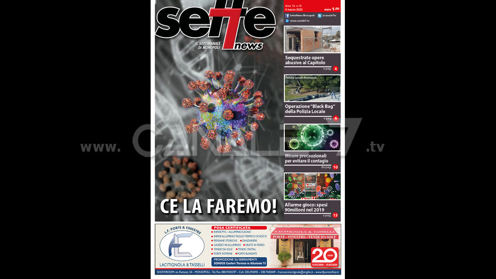 E’ in edicola Sette News. In copertina “ Ce la faremo!”. Ampie pagine e servizi sull’emergenza Coronavirus, sulle misure di prevenzione a livello cittadino. All’interno “ Sequestrate opere abusive al Capitolo”. I controlli sono stati effettuati dalla Polizia Locale. “ Operazione Black Bag”. Operazione sulla lotta all’abbandono dei sacchetti neri di rifiuti indifferenziati. 156 sanzioni e due denunce per abbandono di amianto. “ Misure precauzionali per evitare il contagio”. Tutte le misure cautelative per contenere la diffusione del Covid- 19 disposte dal governo nazionale. “ Allarme gioco: spesi 90 milioni nel 2019”. A Monopoli spesi nel 2019 quasi 90 milioni di euro nel gioco. Numeri paurosi quelli che arrivano dall’Agenzia delle dogane e dei Monopoli. In questo numero ampie pagine di cronaca, politica, attualità, sport, rubriche e appuntamenti. Sette News è in tutte le edicole di Monopoli.