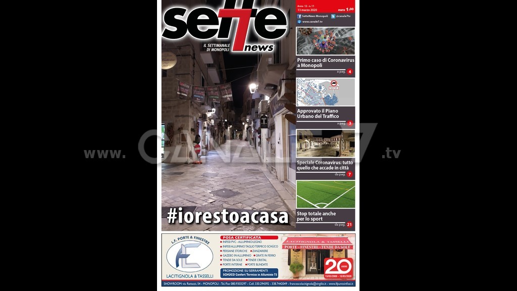 E’ in edicola Sette News. In copertina “ #iorestoacasa”.E’ l’invito accorato da parte delle istituzioni a rimanere a casa per evitare la diffusione del Covid-19. All’interno “ Primo caso di Coronavirus a Monopoli”. L’annuncio del sindaco Angelo Annese dal suo profilo Facebook mercoledì 11 marzo alle 20.07. “ Speciale Coronavirus: tutto quello che accade in città”. Dal decreto del premer Conte alle reazioni della città dal mondo politico a quello economico. “ Approvato il Piano del Traffico”. Il piano è mirato a migliorare la circolazione. Tra le priorità l’intervento in tre incroci fissi. “ Stop totale anche per lo sport”. Si ferma anche il modo dello sport. Si coglie l’occasione per fare il punto della situazione della stagione agonistica. In questo numero ampie pagine di cronaca, politica, attualità, sport, rubriche e appuntamenti. Sette News è in tutte le edicole di Monopoli.