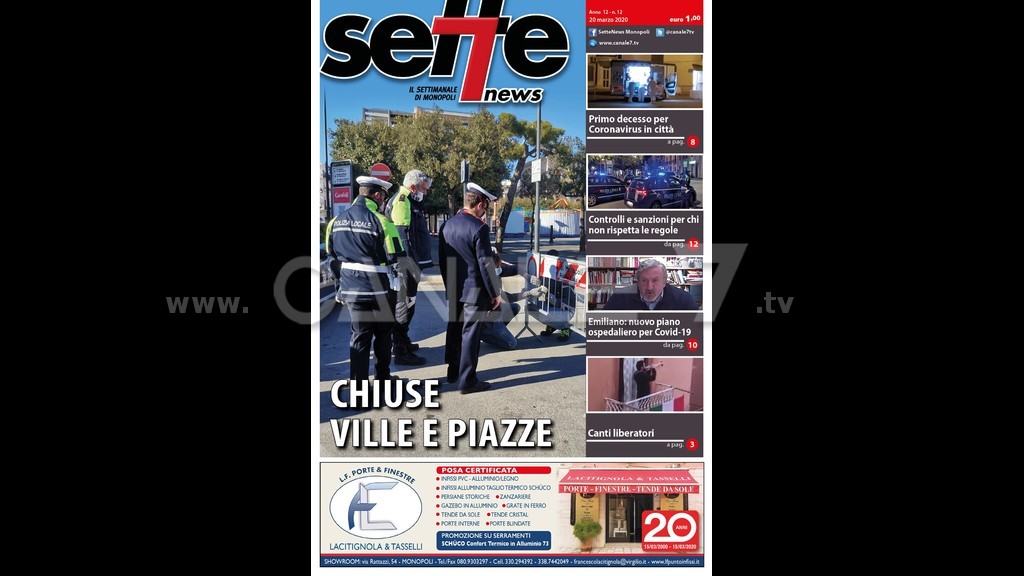 E’ in edicola Sette News. In copertina “ Chiuse ville e piazze”. Il sindaco Angelo Annese per l’emergenza sanitaria a malincuore prende la drastica decisione di chiudere piazze, parchi e ville. All’interno “ Primo decesso per Coronavirus in città.”. Non e l’ha fatta la signora prima contagiata in città dal Covid- 19. E’ deceduta martedì scorso. “ Controlli e sanzioni per chi non rispetta le regole”. All’opera la polizia locale diretta dal comandante Michele Cassano. Passeggiavano in bicicletta in tre denunciati dai Carabinieri. Non avevano nessun motivo per stare fuori casa, come disposto dalle vigenti norme. “ Emiliano : nuovo piano ospedaliero per Covid-19”. Il governatore in videoconferenza stampa con i relatori presenti in una stanza virtuale. “ Canti liberatori”. Canti dai balconi e luci contro il coronavirus. Un flashmob canoro per sentirsi uniti in u abbraccio virtuale. In questo numero ampie pagine di cronaca, politica, attualità, sport, rubriche e appuntamenti. Sette News è in tutte le edicole di Monopoli.