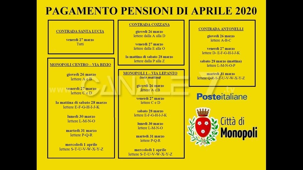 A partire da domani giovedì 26 marzo a Monopoli vengono anticipati i pagamenti delle pensioni di aprile 2020, per andare incontro ai cittadini, per effetto delle restrizioni ministeriali dovute all’emergenza sanitaria Coronavirus e per evitare assembramenti agli sportelli postali. E comunque i pagamenti dovranno svolgersi attenendosi alle disposizioni vigenti sul distanziamento sociale. Queste agevolazioni sono state rese possibili grazie a un’intesa tra il Comune di Monopoli e Poste Italiane. A Monopoli sono attivi cinque uffici di Poste Italiane. Monopoli Centro di via Bixio, Via Lepanto, Contrada Santa Lucia, Contrada Cozzana e Contrada Antonelli. Per i vari uffici del territorio monopolitano, dalla sede centrale a quelle periferiche, dove è attivo il pagamento mensile delle pensioni, per ogni ufficio, sia quelli attivi nell’intera giornata, sia quelli attivi solo al mattino, è stato attuato secondo un calendario alfabetico in vigore dal 26 marzo al primo aprile. ( In foto sotto l'elenco )