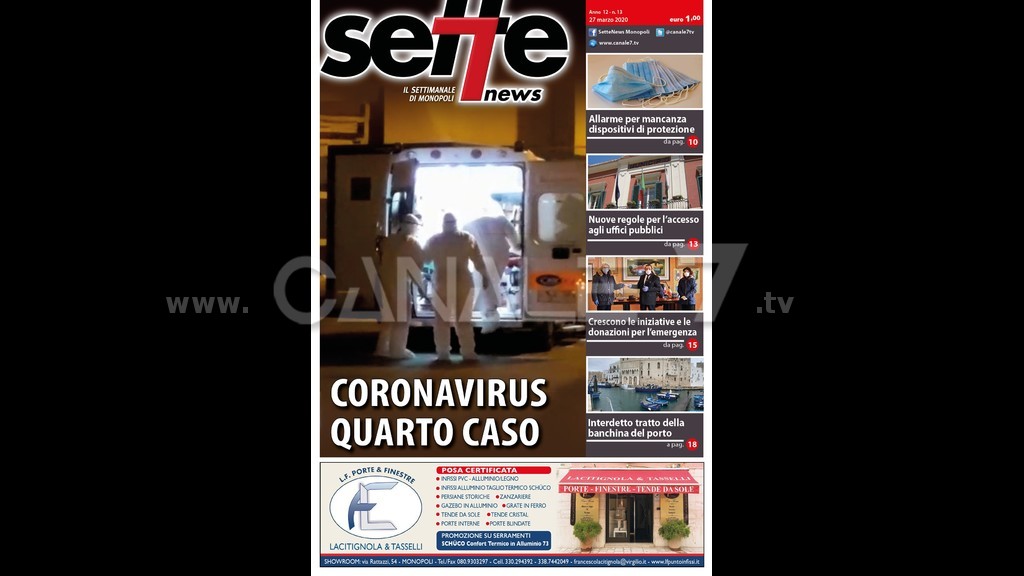 E’ in edicola Sette News. In copertina “ Coronavirus quarto caso”. Positiva un’altra donna. Finora il virus in città ha infettato solo donne. All’interno “ Allarme mancanza dispositivi di protezione”. Medici di famiglia in prima linea ma disarmati. Gli operatori sanitari lamentano la mancanza di tamponi e di dispositivi di protezione individuale. “ Nuove regole per l’accesso agli uffici pubblici”. Le norme sono in vigore dal 27 marzo. “ Crescono le iniziative e le donazioni per l’emergenza”. 10 mila euro dal Barone Colucci di Plastic Puglia per sostenere chi ha bisogno. La Casa Olearia Italiana don ventilatori polmonari al Pronto Soccorso di Ostuni. “ Interdetto tratto della banchina del porto”. Il provvedimento è della Capitaneria di Porto ed è relativo al tratto di via Porto a causa di problematiche strutturali. In questo numero ampie pagine di cronaca, politica, attualità, sport, rubriche e appuntamenti. Sette News è in tutte le edicole di Monopoli.