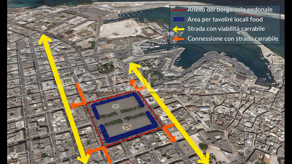 Una possibilità concreta pensiamo possa essere offerta dalla pedonalizzazione dell’anello di piazza Vittorio Emanuele, che consentirebbe di dar respiro economico agli esercenti dei locali prospicienti la piazza e contemporaneamente di decongestionare una zona che risulta da sempre inquinata dal traffico veicolare.
