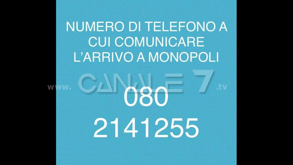 Il numero di telefono al quale va comunicato l’arrivo che sarà attivo da domani mattina alle 8:00 è: 080 2141255