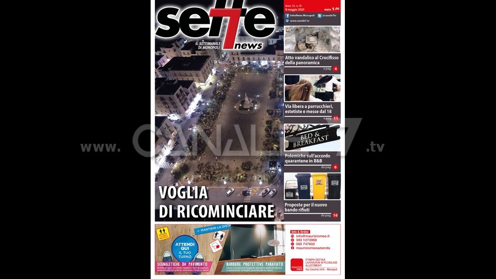 E’ in edicola Sette News. In copertina “ Voglia di ricominciare”. Ampio rendiconto e servizi sull’avvio della seconda fase dell’emergenza sanitaria in città in ogni suo aspetto. All’interno “ Atto vandalico al Crocifisso della panoramica”. Trafugata anche una statua della Madonna in quei luoghi e rotta un’ammagine di San Pio posta ai piedi del Cristo Crocifisso. “ Via libera a parrucchieri, estetiste e messe dal 18 maggio”. L’ordinanza regionale è stata emessa dopo l’incontro con le associazioni e i rappresentanti di categoria. Stabilite le linee guida da seguire. “ Polemiche sull’accordo quarantene in B&B”. Le minoranze polemiche sull’accordo con alcune strutture ricettive e dicono: sindaco faccia avviso pubblico. “ Proposte per il nuovo bando rifiuti”. Si inizia a lavorare per il nuovo bando di assegnazione del servizio rifiuti. Manisporche e Insieme per Monopoli, presentano proposte ed osservazioni. In questo numero ampie pagine di cronaca, politica, attualità, sport, rubriche e appuntamenti. Sette News è in tutte le edicole di Monopoli.