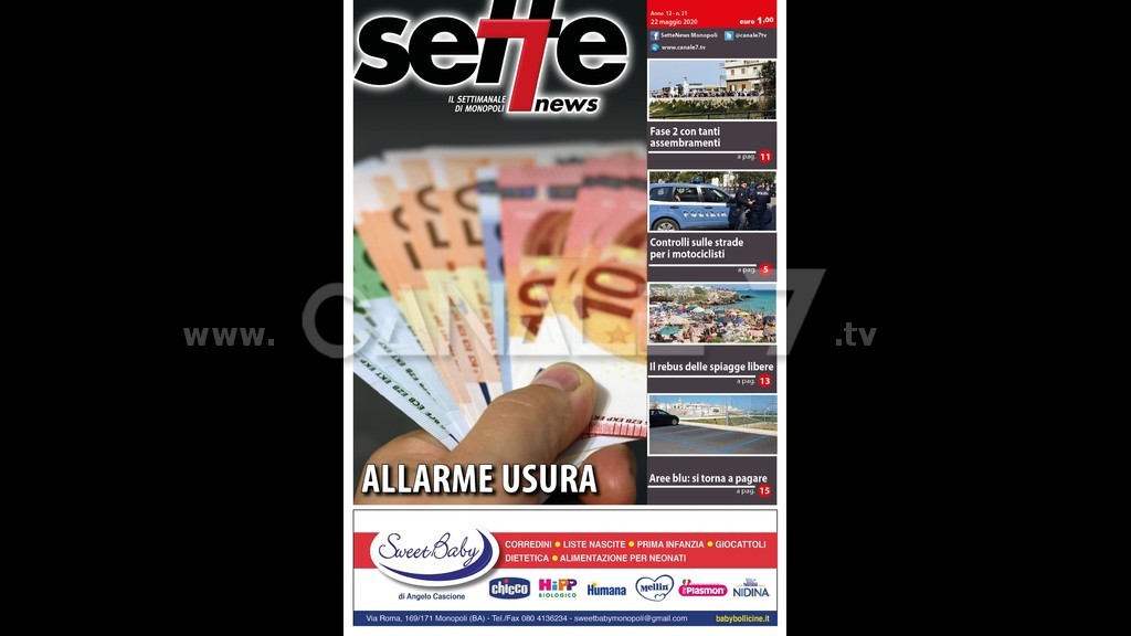 E’ in edicola Sette News. In copertina “ Allarme usura” . Nel barese è allarme usura dopo il lockdown: cento denunce nelle ultime settimane. Nel report della GdF i Comuni considerati più “ ricchi” tra cui Monopoli. All’interno “ Fase 2 con tanti assembramenti”. Anche poche mascherine. Preoccupano gli atteggiamenti di tanti che pensano sia stata già superata l’emergenza. “ Controlli sulle strade per i motociclisti”. Tenute d’occhio soprattutto le diverse provinciali che portano in città. “ Il rebus delle spiagge libere”. Da lunedì si potrà andare al mare ma restano molti dubbi. “ Aree blu: si torna a pagare”. Si torna al pagamento dal 1° giugno. Il servizio riprende dopo la sospensione . Si studiano misure di proroga per gli abbonati. In questo numero ampie pagine di cronaca, politica, attualità, sport, rubriche e appuntamenti. Sette News è in tutte le edicole di Monopoli.