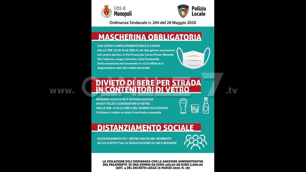 MONOPOLI - L'impressione che si ricava nel primo giorno di vigenza dell'ordinanza 204 del 28 maggio 2020, con cui il Sindaco di Monopoli Angelo Annese ha dettato le nuove norme per regolamentare la movida in periodo di emergenza Covid - 19, è assolutamente positiva. La prima fotografia scattata nelle strade del centro storico illustra una popolazione attenta, che ha recepito le disposizioni del primo cittadino, in maniera proattiva, assolutamente collaborativa. Non si sono registrati assembramenti, né pericolosi e indecorosi cumuli di bottiglie di vetro. Ieri sera la Protezione Civile di Monopoli, in particolare l'Associazione Atlantis 27, ha provveduto a informare la popolazione sui contenuti dell'ordinanza, distribuendo i volantini e le locandine esplicativi dei contenuti dell'ordinanza, affissi tra le vie del borgo antico e anche all'interno dei tanti pubblici esercizi. La Protezione Civile non si è limitata alla sola informazione, provvedendo anche a distribuire le mascherine ai pochi cittadini che ne erano sprovvisti. Infatti, così come recita l'ordinanza di Annese, è vietato frequentare i luoghi della movida, dalle 18 all'una di notte, senza indossare il necessario, dpi che deve coprire completamente le vie aeree (naso e bocca). Nel primo giorno, dunque, si è avuta un'impressione assolutamente positiva: così come riferisce il personale della Protezione civile impiegato nell'attività di informazione alla popolazione, tutti i commercianti e gli imprenditori si sono dimostrati favorevoli all'ordinanza, conoscendone perfettamente i contenuti. Anche la gente si è dimostrata assolutamente d'accordo con l'iniziativa di Annese, compresi i pochi che giravano ancora senza mascherina. Tutti, insomma, conoscevano le disposizioni dell'ordinanza: per i tanti turisti che in questi giorni frequenteranno Monopoli, le informazioni sull'ordinanza sono contenute in manifesti affissi nei punti di aggregazione e in quelli di accesso al Borgo Antico. Questa sera si replica, con una novità. Oltre all'attività di informazione, così come disposto dal dirigente del Commissariato di Pubblica Sicurezza, nei fine settimana ci saranno pattuglie interforze che vigileranno sul rispetto delle norme sul contrasto alla diffusione del contagio da coronavirus, tra cui anche l'ultima ordinanza del Sindaco di Monopoli.