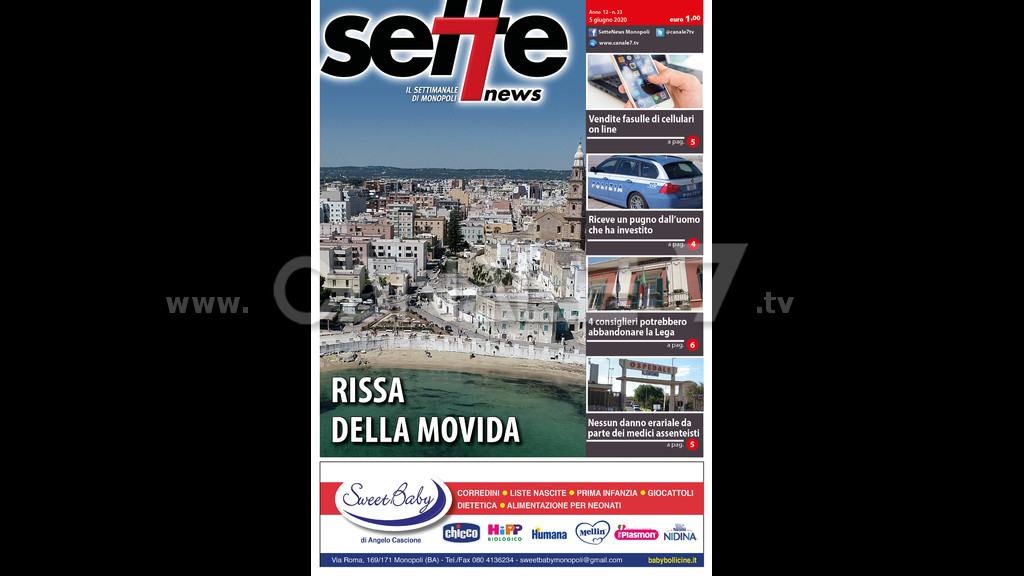 E’ in edicola in nuovo numero di Sette News. In copertina “ Rissa della Movida”. Rissa tra giovani nella zona della movida a Porta Vecchia: feriti e denunciati. 2 giugno poco tranquillo per gli agenti del locale commissariato. All’interno “ Vendita fasulle di cellulari on line”. Cellulari venduti online e mai spediti: denunciati due truffatori. L’indagine è partita dopo una segnalazione al Commissariato. “ Riceve un pugno dall’uomo che ha investito”. Monopolitana urta un uomo con l’auto e questo gli rompe il naso. Disavventura per una donna che non si aspettava tale reazione. “ 4 consiglieri potrebbero abbandonare la Lega”. Lo strappo dopo la candidatura di Nuccio Alteri da parte dei vertici regionali. “ Nessun danno erariale da parte dei medici assenteisti”. Archiviate dalla corte dei conti le contestazioni per i medici degli ospedali di Monopoli e Molfetta. Nessun danno erariale imputato ad alcuni dei professionisti accusati di assenteismo. In questo numero ampie pagine di cronaca, politica, attualità, sport, rubriche e appuntamenti. Sette News è in tutte le edicole di Monopoli.