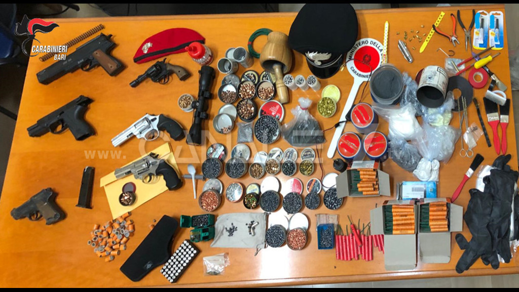 Nel corso di un servizio disposto dal Comando Provinciale dei Carabinieri di Bari, i militari della Compagnia di Modugno con il supporto dello Squadrone Eliportato dei Cacciatori di Puglia hanno tratto in arresto 47enne di Modugno, autista, residente a Grumo Appula. L’altra mattina, una manovra spericolata mentre era alla guida di una FIAT Croma, sicuramente finalizzata ad eludere il controllo dei Carabinieri, ha spinto i militari ad inseguire e bloccare il conducente del mezzo, ed a controllarlo. L’uomo è stato sottoposto a perquisizione personale il cui ha permesso di rinvenire una pistola a tamburo, calibro 5,6 di fabbricazione Ceca, con otto cartucce, occultata all’interno della tasca di un giubbino, nonché un involucro contenente 5 grammi di marijuana. La perquisizione, quindi, è stata estesa all’abitazione del C.G. ed alle relative pertinenze, ove ne è scaturito il rinvenimento e sequestro di un vero e proprio arsenale composto da: una pistola lanciarazzi marca olimpic 6 cal. 22, una pistola a tamburo marca randz curte cal. 4, una pistola ad aria compressa marca weihrauch cal. 4,5, una pistola a salve marca bruni cal. 9 senza matricola e priva del tappino rosso, n. 200 cartucce cal. 5.6, n. 90 cartucce cal. 6, n. 97 (novantasette) cartucce cal. 22, n. 65 cartucce a salve cal. 9, nonché kg. 1,550 di polvere pirotecnica, miccia pirotecnica, n. 20 confezioni di piombini di vario calibro, capsule percussori e ogive, una katana, n. 71 artifizi pirotecnici categoria 5 ed un kit completo per la fabbricazione e produzione di cartucce di fucile compreso di inneschi, pesi e bilancino, orlatrice, disinnescatore e innescatore, dosatore di polvere da sparo, dosatori manuali di polvere da sparo, mortaietto-battitore. Le armi ed il materiale rinvenuto sono stati sequestrati mentre il soggetto è stato arrestato e condotto presso il carcere di Bari. Gli accertamenti dei Carabinieri sono ora finalizzati a capire come mai l’uomo, un autotrasportatore, incensurato, avesse nella disponibilità tutte le armi e il munizionamento rinvenuto.