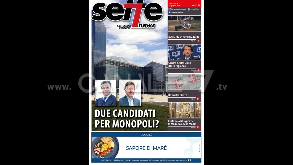 E’ in edicola il nuovo numero di Sette News. In copertina “ Due candidati per Monopoli? Ipotesi sulle candidature al consiglio regionale. Stefano Lacatena, avvocato e attuale delegato all’urbanistica per il centrodestra e Angelo Barnaba, avvocato e dirigente dell’Action Now per il centrosinistra. All’interno “ Incidente in città: tre feriti”. Tre feriti è il bilancio di un incidente stradale avvenuto in via Luigi Capitanio giovedì sera. Si sono scontrate una Fiat 500 su cui viaggiavano madre e figlioletta e una moto Bmw R 1250 condotta da un giovane. “Centro destra unito per le Regionali”. Attorno alla candidatura alla presidenza regionale di Raffaele Fitto, unità d’intenti tra le componenti Lega, Fratelli d’Italia e Forza Italia. “ Box nelle piazze”. Aree per le attività commerciali in piazza Vittorio Emanuele, nell’ambito delle iniziative Restart, per superare i notevoli problemi economici delle imprese dovute all’emergenza sanitaria. “ Festa solo liturgica per la Madonna della Madia”. Programma religioso ricco, ma senza la cerimonia dell'approdo. Annullato completamente il programma civile a causa dell'emergenza coronavirus. In questo numero ampie pagine di cronaca, politica, attualità, sport, rubriche e appuntamenti. Sette News è in tutte le edicole di Monopoli.