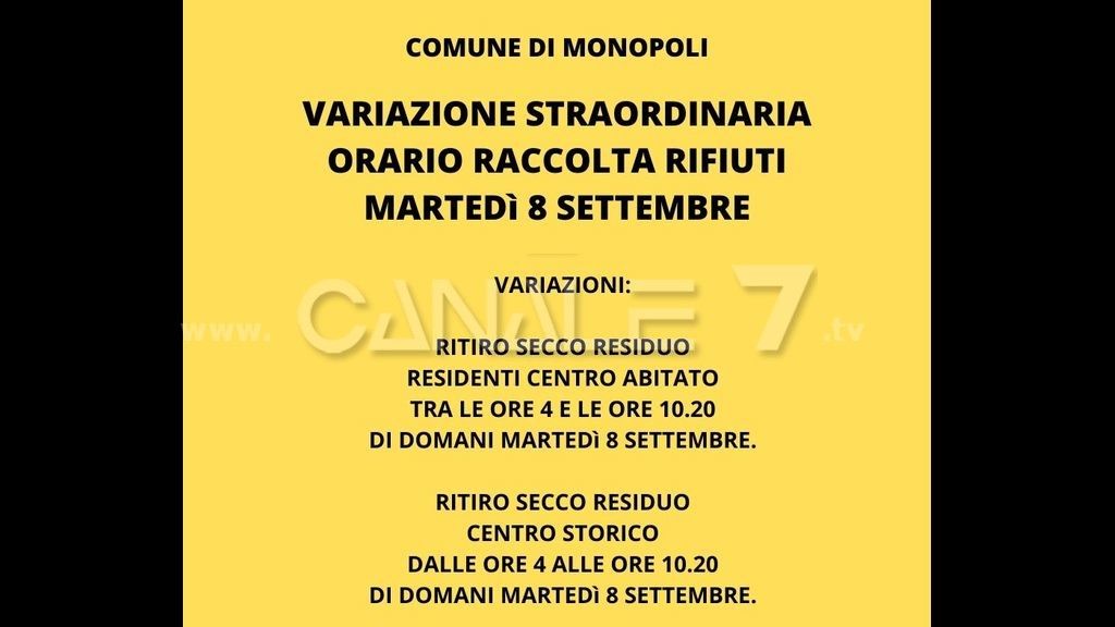 (Da comunicato) - Non sono ancora stati risolti i problemi tecnici dell’impianto che riceve i rifiuti indifferenziati prodotti dal Comune di Monopoli che già la scorsa settimana avevano causato alcuni ritardi nei tempi di trasporto e conferimento. È bene ribadire che si tratta di un impianto che non dipende dal Comune di Monopoli, né da Energetikambiente, l’azienda che si occupa della raccolta, del trasporto e conferimento dei rifiuti della città monopolitana.E anche oggi amministrazione comunale e azienda sono state costrette a varare un provvedimento straordinario per evitare ripercussioni sul servizio in città. Per questa ragione sono stati modificati gli orari di raccolta dei rifiuti per la giornata di domani, martedì 8 settembre. Gli operatori dell’azienda ritireranno il rifiuto “secco residuo” dei residenti nel centro abitato, tra le ore 4 e le ore 10:20 di domani, martedì 8 settembre, invece che dalle ore 6 alle ore 12.20, come accade abitualmente. La raccolta del “secco residuo” nel centro storico non subirà variazioni sull’orario di avvio; si partirà, come di consueto, alle ore 4 di stanotte, fino alle ore 10.20 di domani. I cittadini, pertanto, sono pregati di non conferire i rifiuti dopo l’orario di inizio del servizio. Azienda e Amministrazione comunale chiedono la collaborazione di tutti per affrontare questa emergenza che non dipende in alcun modo dalla loro volontà.