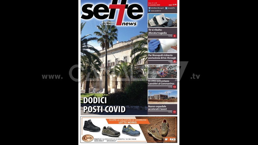 E’ in edicola Sette News. In copertina “ Dodici posti covid”. Dodici posti al S. Giacomo dedicati ai malati di Coronavirus. Il sindaco Annese: “ Ma il nostro nosocomio non è un ospedale Covid”. All’interno “Tir si ribalta:sfiorata tragedia”. Autista illeso, ma la statale 16 è rimasta bloccata per ore. “ Per Monopoli richiesta postazione drive-troogh”. La richiesta del consigliere regionale Fabiano Amati e già inoltrata dal sindaco Angelo Annese e dal consigliere regionale, Stefano Lacatena. “In città aumentano i positivi al Coronavirus”. In città sono 56 i positivi al Covid. L’aggiornamento del primo cittadino. “ Nuovo ospedale accelerati lavori”. Accelerati i lavori con l’ingaggio di nuovi operai. Si cerca di recuperare il tempo perso a causa del lockdown del marzo scorso. In questo numero ampie pagine di cronaca, politica, attualità, sport, rubriche e appuntamenti. Sette News è in tutte le edicole di Monopoli.