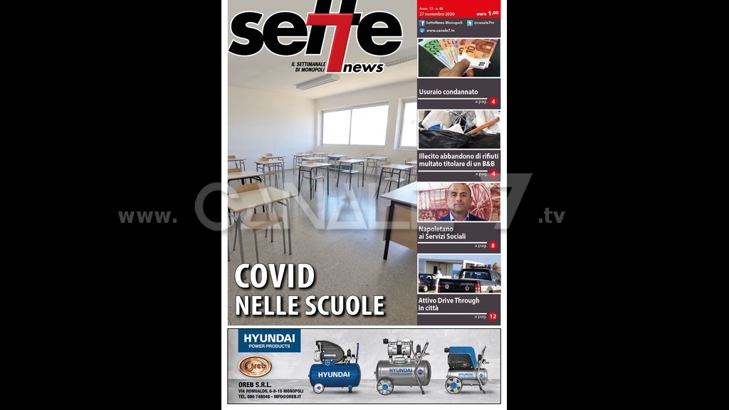 E’ in edicola Sette News. In copertina “ Covid nelle scuole”. Casi di Covid nelle scuole e alcune classi finiscono in quarantena. Nessun cluster, si tratta di una misura cautelare su suggerimento della Asl. All’interno “ Usuraio condannato”. Noto pregiudicato 58enne monopolitano condannato a 8 anni. L’uomo non esitava a sferrare calci, pugni e tastate per riavere i soldi prestati a strozzo. “ Illecito abbandono di rifiuti mutato titolare di B&B”. Sorpreso ad abbandonare rifiuti un titolare di una struttura ricettiva. Aveva lasciato tre bustoni neri per strada: scoperto dalla solerzia della Polizia Locale. “ Napoletano ai Servizi Sociali”. Il vice sindaco Alessandro Napoletano acquisirà anche la delega ai Servizi Sociali. Per la nomina del nuovo assessore se ne riparlerà nel quadro di un rimasto generale. “ Attivo Drive Through in città”. Avviato il drive through per tamponi molecolari. Nella prima giornata operativa sono stati processati una quarantina di test. In questo numero ampie pagine di cronaca, politica, attualità, sport, rubriche e appuntamenti. Sette News è in tutte le edicole di Monopoli.