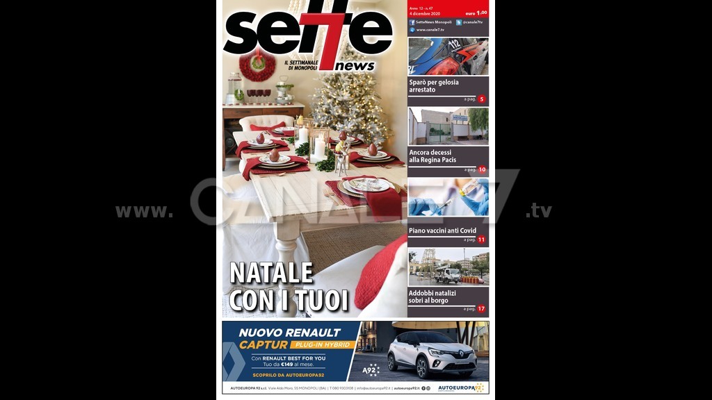 E’ in edicola Sette News. In copertina “ Natale con i tuoi”. Il nuovo Dpcm decreta misure e restrizioni per le prossime festività. A Natale, Santo Stefano e Capodanno non si potrà uscire dal proprio comune. All’interno “ Sparò per gelosia arrestato”. Spari contro un 40enne di Monopoli: arrestato dai Carabinieri un uomo di Cisternino. Una lite per una donna all’origine del fatto avvenuto lo scorso 16 novembre. “Ancora decessi alla Regina Pacis”. Ancora un decesso nella rssa, mentre le cose stanno migliorando dal punto di vista dei contagi. “ Piano vaccini anticovid”. Approvato in Parlamento il piano vaccini. Acquisti centralizzati e distribuzione gratuita, le prime dosi da metà gennaio per personale sanitario e soggetti fragili. “ Addobbi natalizi sobri al borgo”. Tuttavia gli addobbi renderanno ancor più bella la città. Grande albero in piazza, pacchi dono e sfere illuminate in altri luoghi. In questo numero ampie pagine di cronaca, politica, attualità, sport, rubriche e appuntamenti. Sette News è in tutte le edicole di Monopoli.