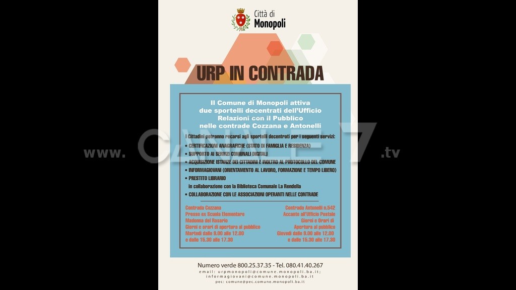 Il Comune di Monopoli attiva due sportelli decentrati dell'Ufficio Relazioni con il Pubblico nelle contrade Cozzana e Antonelli. Le due sedi saranno presentate sabato 16 gennaio alle ore 19,30 (Cozzana) e domenica 17 gennaio alle ore 12 (Antonelli). La sede decentrata di Contrada Cozzana, sita nella ex Scuola Elementare di "Madonna del Rosario", è attiva ogni martedì dalle ore 9:00 alle ore 12:00 e dalle ore 15:30 alle ore 17:30. La sede decentrata di Contrada Antonelli n. 542 è attiva ogni giovedì dalle ore 9:00 alle ore 12:00 e dalle ore 15:30 alle ore 17:30. I cittadini potranno recarsi agli sportelli decentrati per i servizi di certificazione anagrafica (stato di famiglia e residenza), supporto all’utilizzo dei servizi comunali resi in forma digitale, acquisizione di istanze dei cittadini e inoltro all’ufficio protocollo comunale, Informagiovani (orientamento al lavoro, alla formazione e al tempo libero), prestito librario da rendere in collaborazione con la Biblioteca Rendella e collaborazione con le associazioni operanti nelle contrade.