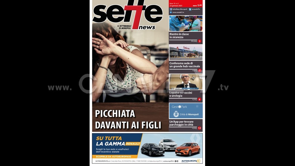 E’ in edicola Sette News. In copertina. “ Picchiata davanti ai figli”. Arrestato dai carabinieri 35 enne capofamiglia dopo l’ennesimo episodio di violenza domestica. All’interno “ Rientro in classe in sicurezza”. La Regione si organizza per assicurare il potenziamento del trasporto scolastico, presidi sanitari, screening e vaccini. “ Conforama sede di un grande hub vaccinale”Sarà allocato nel padiglione espositivo dell’ipermercato Conforama: potrà effettuare 2000 vaccini al giorno. “ Lopalco su vaccini e urologia”. L’assessore regionale alla sanità a Perché? parla di vaccini, sanità nelle scuole e obbligo vaccinale per i sanitari. “ Un app per trovare parcheggio in città”. E’ attivo in un app della Gestopark per la gestione dei parcheggi a pagamento. In questo numero ampie pagine di cronaca, politica, attualità, sport, rubriche e appuntamenti. Sette News è in tutte le edicole di Monopoli.