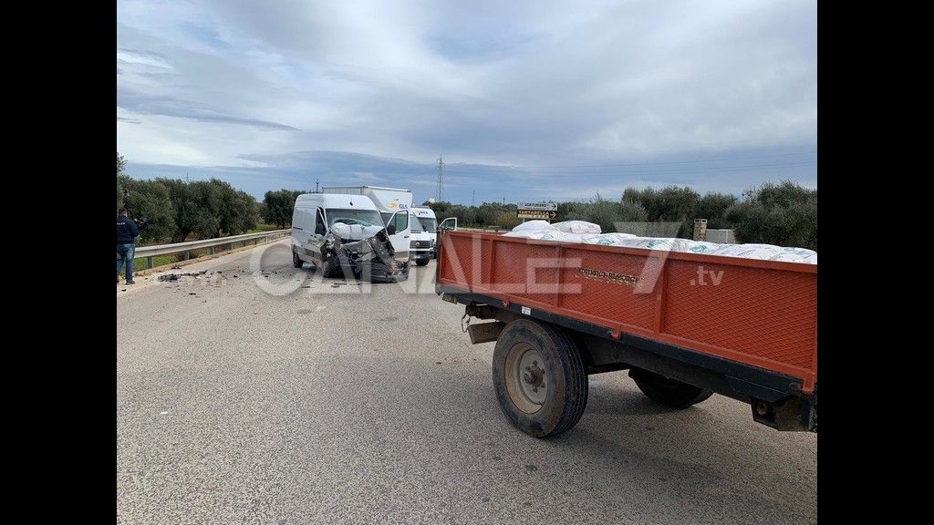 MONOPOLI- Incidente stradale nella tarda mattinata odierna sulla complanare che dalla Statale 16 porta alla provinciale per Conversano. Per cause tutte da accertare un furgone adibito al trasporto di pacchi ha tamponato violentemente un trattore con annesso rimorchio. Fortuna ha voluto che il mezzo agricolo, condotto da un bracciante monopolitano, trasportasse sacchi con del mangime e di conseguenza fosse abbastanza pesante. La parte anteriore del furgone, invece, si è letteralmente accartocciata. Per fortuna non si registrano feriti gravi anche se sia il conducente del trattore che quello del furgone hanno dovuto far ricorso alle cure dei sanitari. Entrambi sono stati portati all’ospedale “S. Giacomo” per accertamenti. I rilievi di rito sono stati curati dai Carabinieri della Stazione di Monopoli mentre agenti del locale Commissariato hanno provveduto a regolare la viabilità