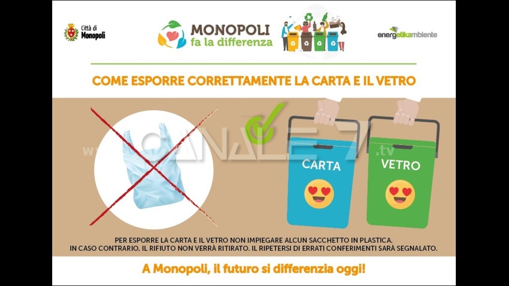 MONOPOLI - Il Comune ed Energetikambiente precisano in un comunicato alla cittadinanza che, nell’ambito del servizio della raccolta differenziata in città, per un più corretto conferimento del rifiuto relativamente alle frazioni vetro e carta e cartoncino non è necessario l’impiego del sacchetto di plastica. Per queste frazioni il conferimento deve avvenire esclusivamente con l'utilizzo della sola attrezzatura (cioè direttamente nella pattumella). In mancanza, conclude il comunicato, il rifiuto esposto non potrà essere ritirato. Il ripetersi di errati conferimenti sarà segnalato agli organi di vigilanza e controllo.